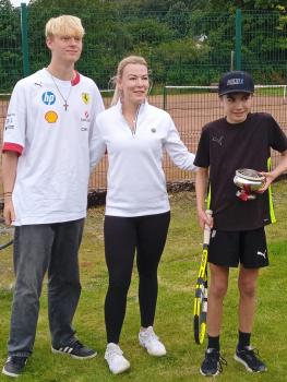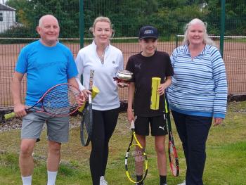 TENNIS CLUB Tennis Section THE MEG HENRY MEMORIAL ROSEBOWL A grand day was had at the Club on Sunday 10th August when a very friendly tournament took place in memory of Meg Henry - a stalwart supporter of the Club. Along with members of Meg's family, there was a mixed group of tennis players from IBTC and Castle Tennis Club. The weather was very kind and the outcome of the day was that honours were shared between IBTC and Castle. Lauren Black (Castle) and Roan Wright (IBTC) being the winning pair and Kat Ross (IBTC) and Jaroslaw Michalak (Castle) being the runners up. Innes (Meg's grandson) presented the Meg Henry Rosebowl to the winners along with a congratulatory tube of tennis balls. All in all, a lovely day! Haste ye Back!